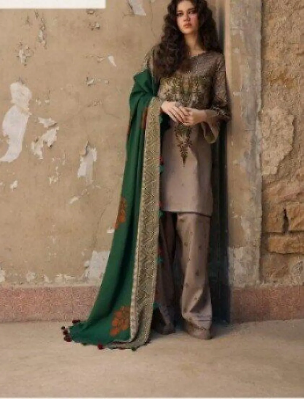 Upgrade your wardrobe with this elegant 3-piece lawn suit designed for a sophisticated and graceful look. The shirt is made from premium quality khadar fabric, featuring a beautiful olive floral print on a soft beige base that enhances its luxurious appearance.