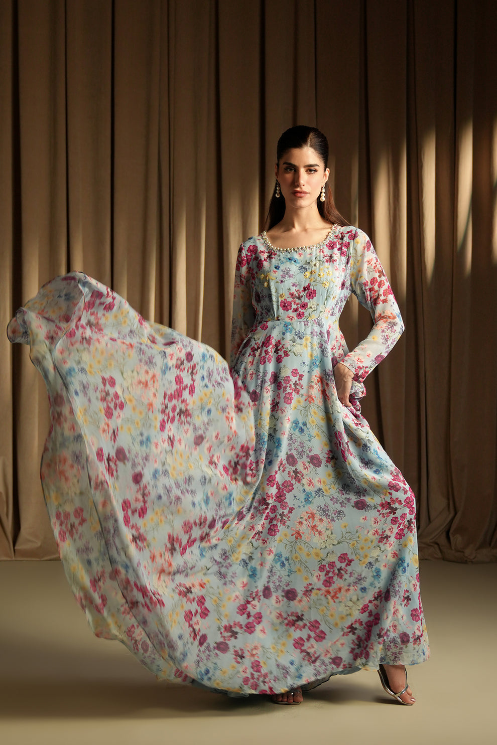 This flared bana dora dress showcases a floral print, crew neck with back closure and full-length sleeves. Accented by a crystal-embellished