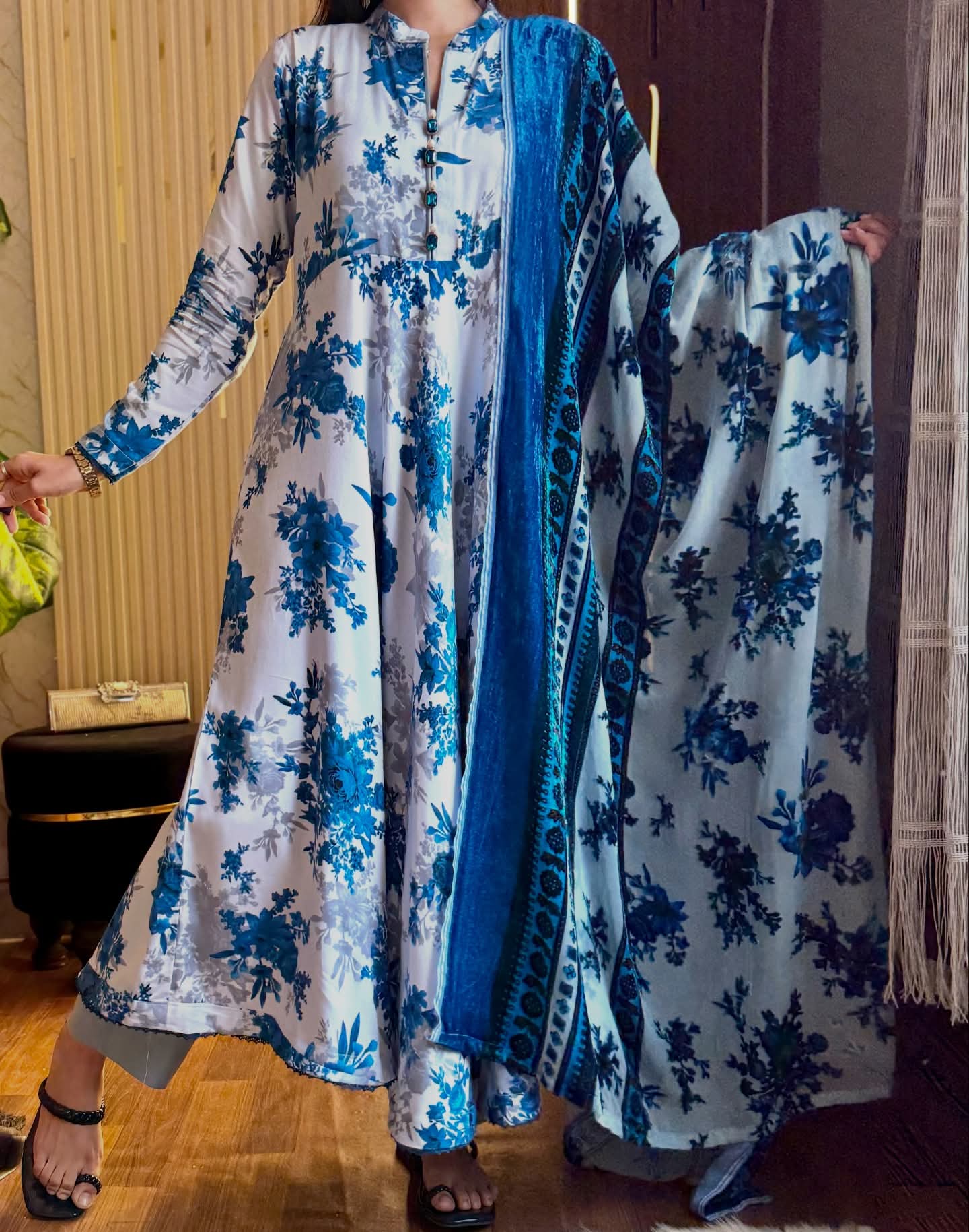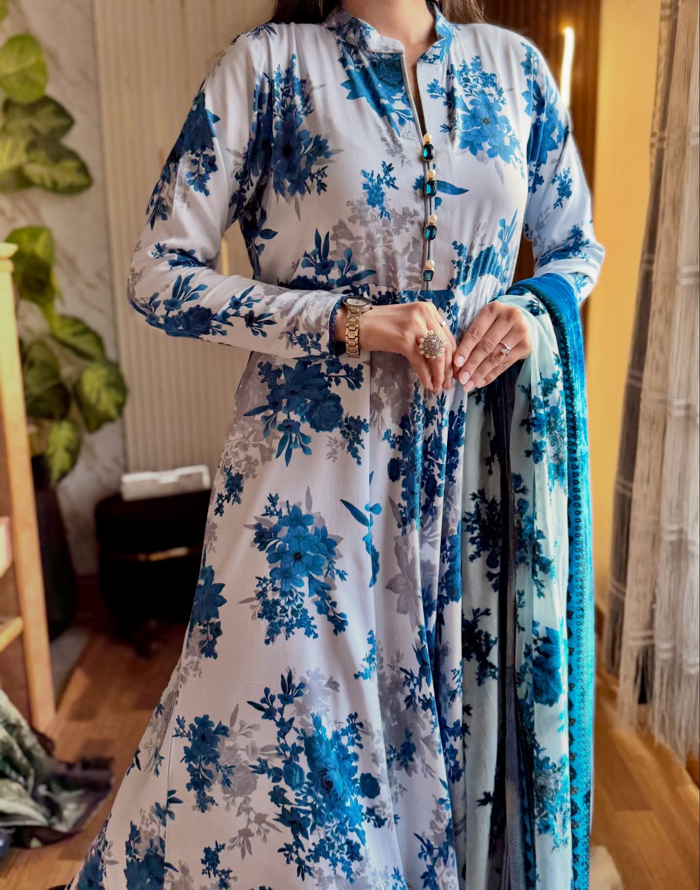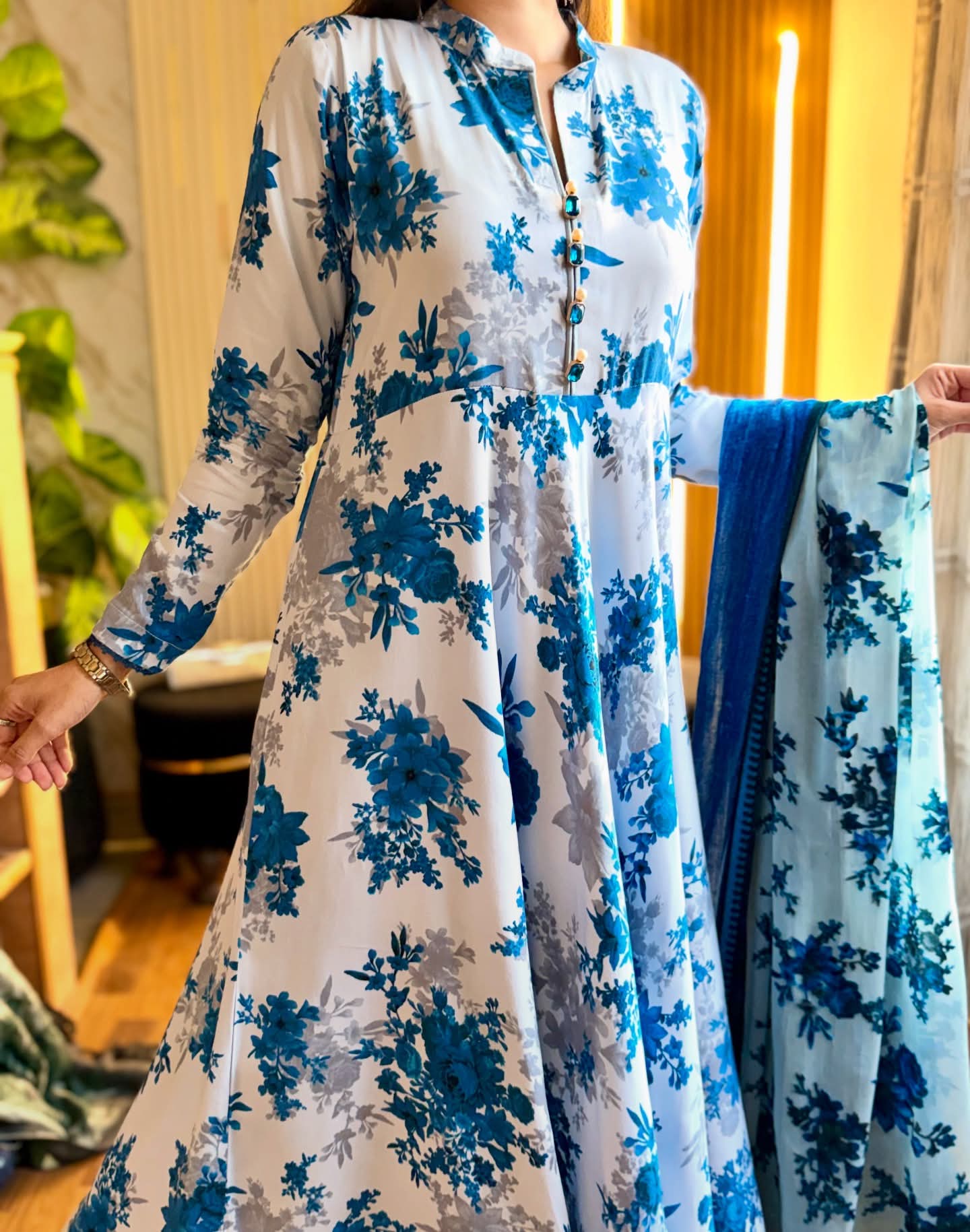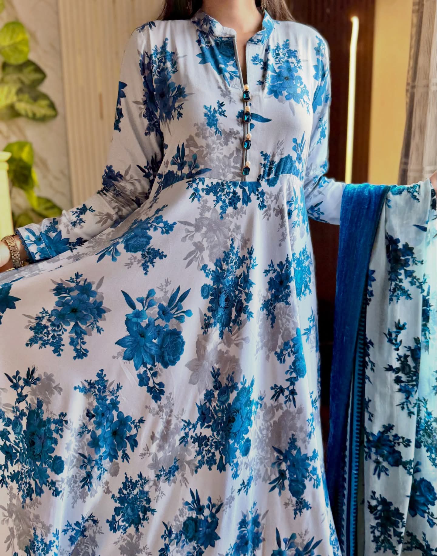 This dress, made in bana dora fabric, in floral print, features scoop neckline, crystal embellishment along the neckline with crystal embellished spray along the bodice, tie-up at the back with crystallized tassel detail, bodice has waist & bust darts for fitting, full length sleeves with crystal hangings, side zipper closure and flared hem.