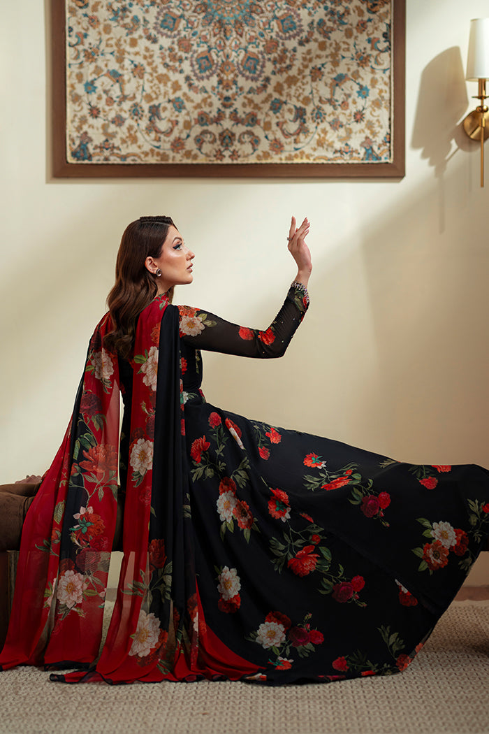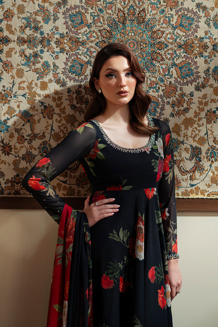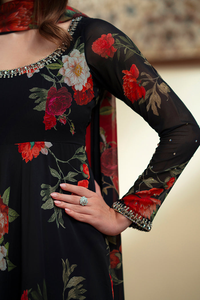 Crafted with elegance, this ensemble features a flowy four season fabric frock adorned with delicate floral patterns, paired seamlessly with a luxurious dupatta. The hand-embellished neckline and sleeves add a touch of artisanal charm, making it a timeless statement of grace and sophistication.