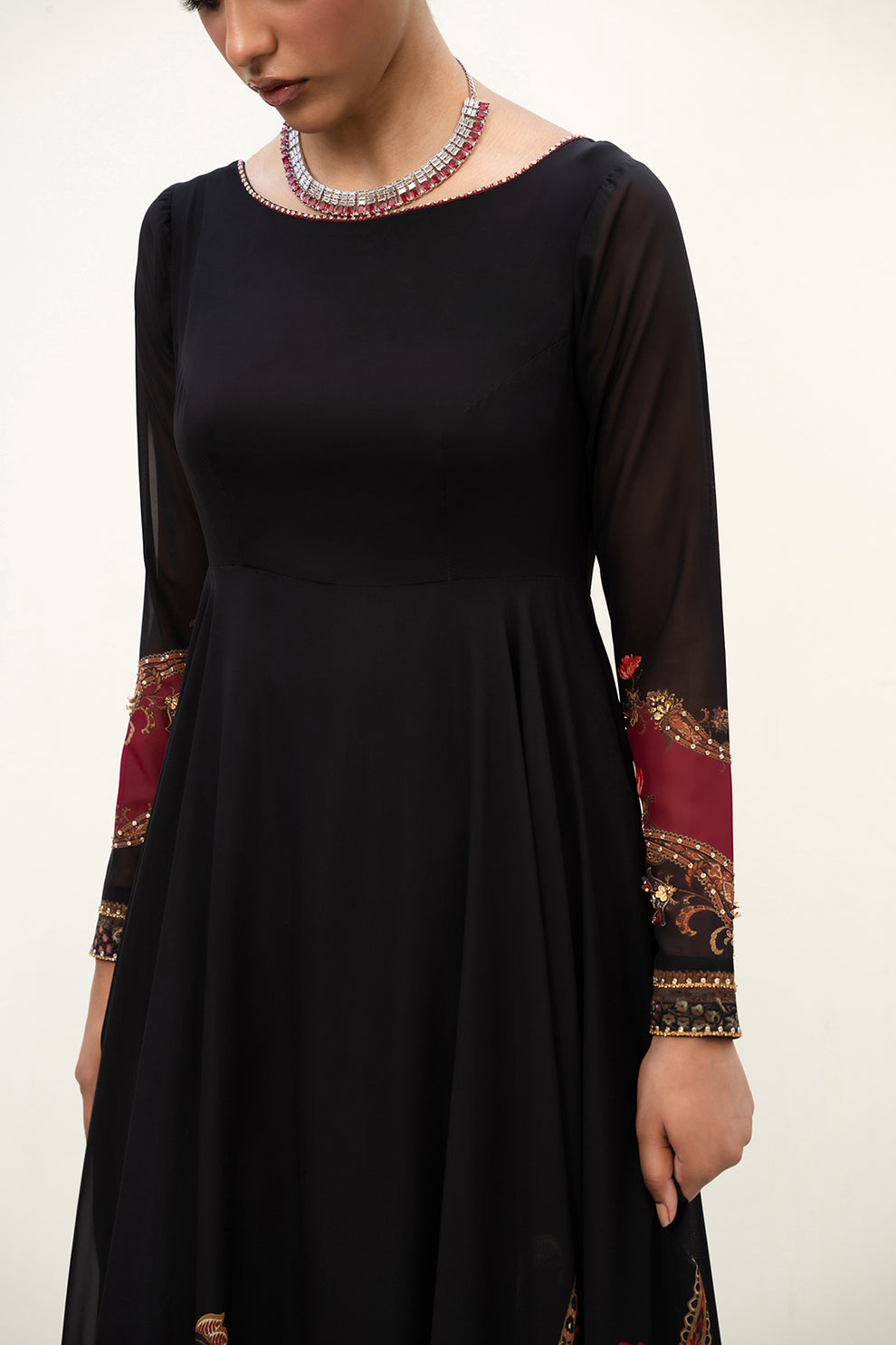 This pishwaz made in black soft georgette Bana Dora fabric in print features round embellished neckline, bust & waist darts, full length sleeves with slits and snap button closure, flared hem and side zipper closure. The pishwas has an attached viscose inner.