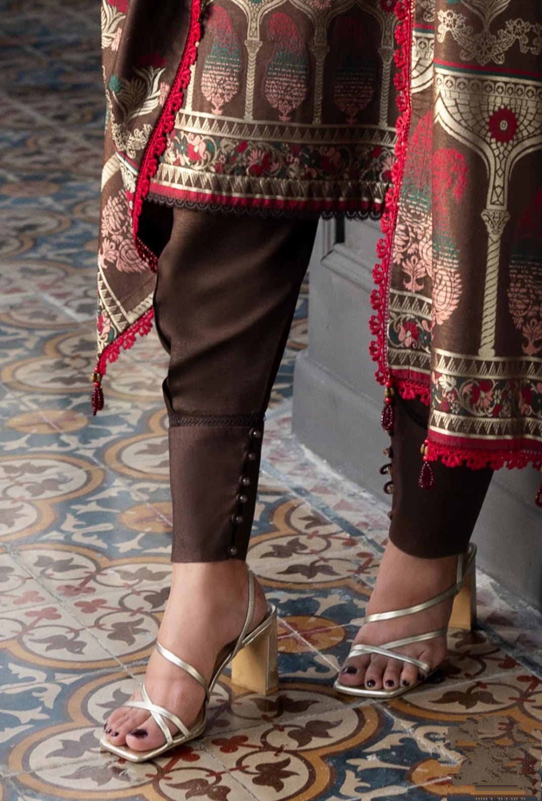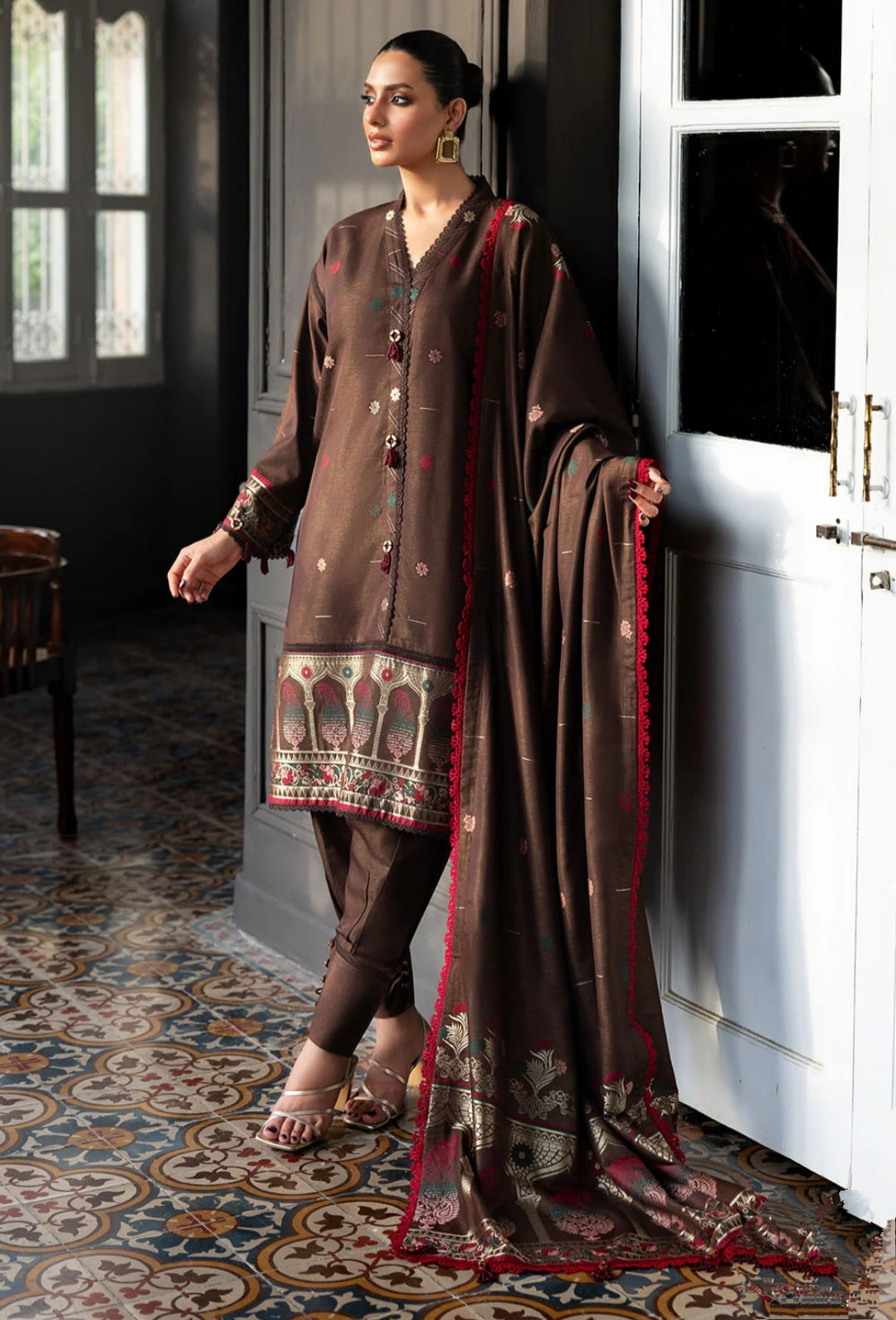 The deep chocolate brown base is enhanced with fine digital embroidery-inspired prints and delicate red accents, giving it a rich and regal look. The embroidered borders, fancy buttons, and detailed lacework on sleeves and dupatta add a festive charm, making it suitable for both daily wear and special gatherings.