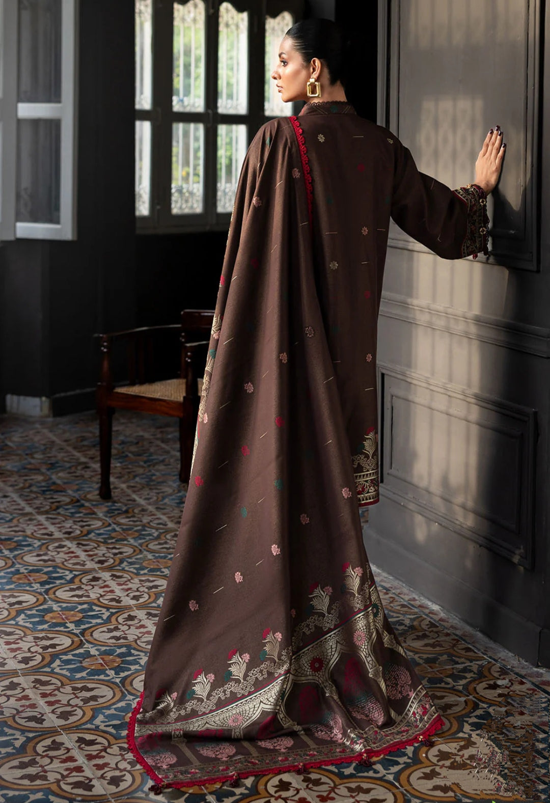 Pair this elegant outfit with maroon khussa or gold jewelry to elevate your winter style effortlessly.