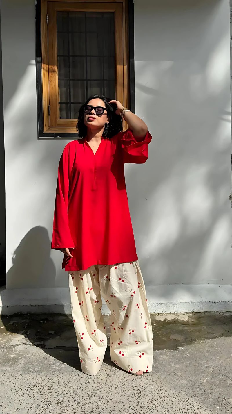 Is jori ne to dil jeet liya. Cherry print wali shalwar bohot cute lag rahi hai aur red kurta bhi perfect hai. Sab pooch rahe hain kahan se liya!