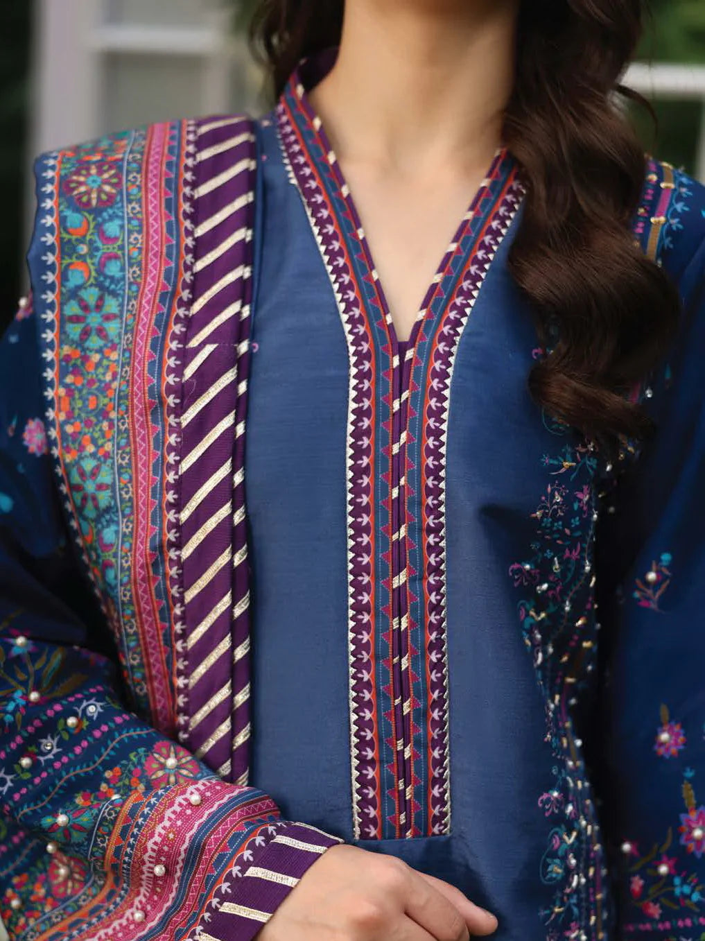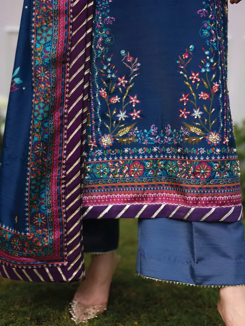 Elevate your winter look with the Rang Rasiya Luxury Manadora GC-A13 — a timeless blend of elegance and sophistication. This stunning 3-piece suit is crafted from premium Manadora fabric, featuring intricate embroidered details on the shirt front, sleeves, and borders. The rich navy base adorned with colorful floral patterns exudes luxury, while the coordinated dyed trouser and beautiful printed shawl dupatta complete the graceful ensemble.