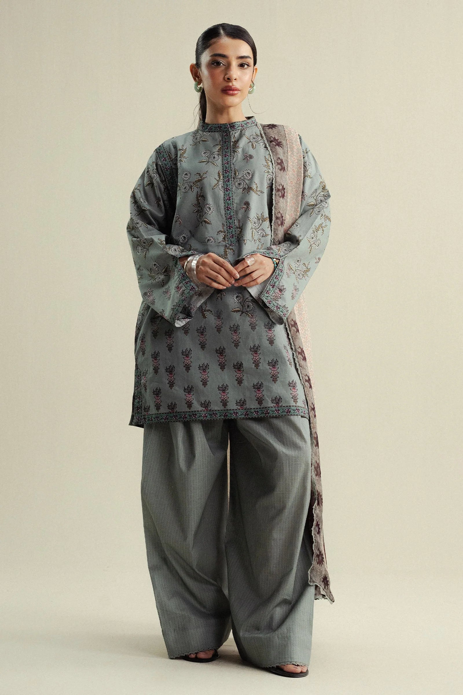 The zinc grey base is beautifully adorned with delicate floral digital prints, giving it a refined, classy look. The shirt features elegant detailing with intricate borders, paired with a matching trouser for a coordinated appearance. The soft printed dupatta completes the outfit, adding a subtle contrast that enhances the entire look.